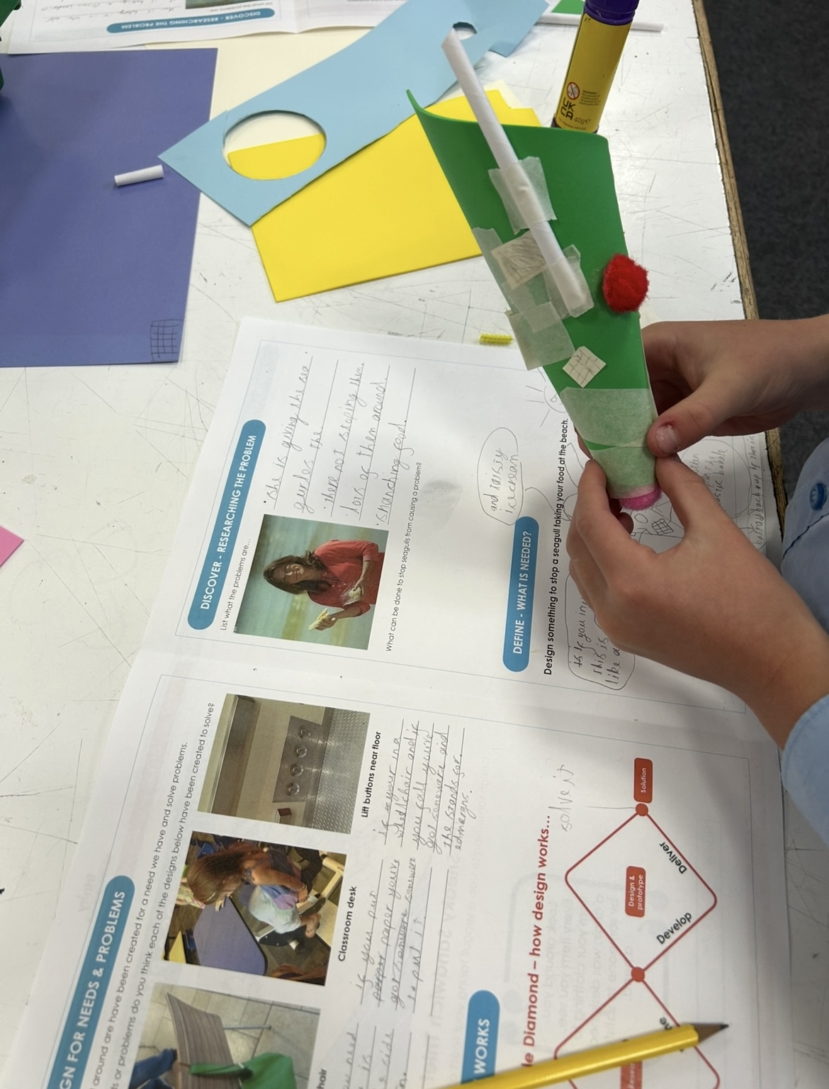Year 5 students worked alongside Year 9, 10 and 13 D&T students at Trinity to look at how to solve a relevant and real-world problem of seagulls stealing food from people at the beach! The students looked into the problem and did some research, before developing some innovative design ideas through sketching and modelling.